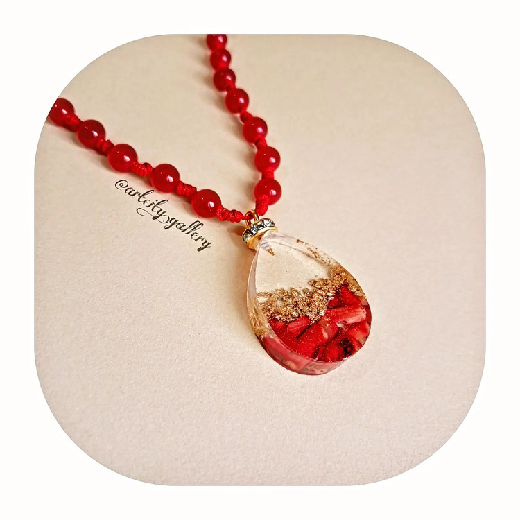 گردنبند زنانه مدل مرجان و مروارید طرح اشک بسیاز زیبا و بی نظیر می باشد.این گوشواره از رزین اپوکسی،ورق طلا، سنگ طبیعی مرجان، و مروارید سنگی ساخته شده است.