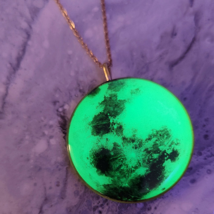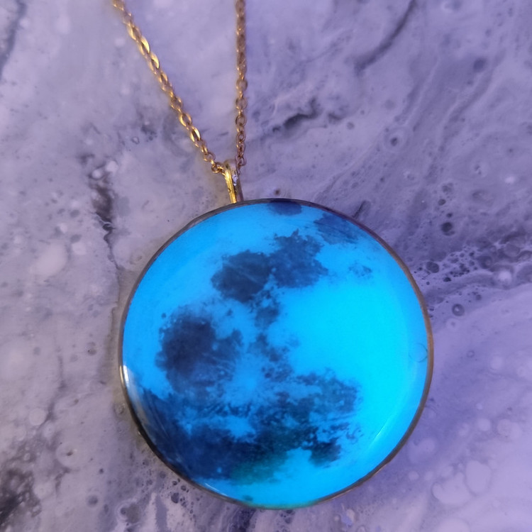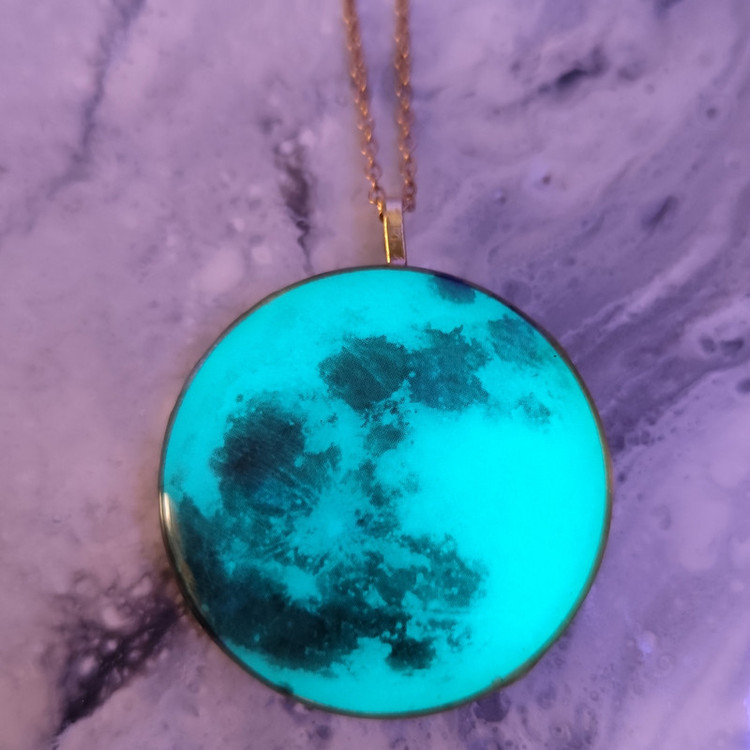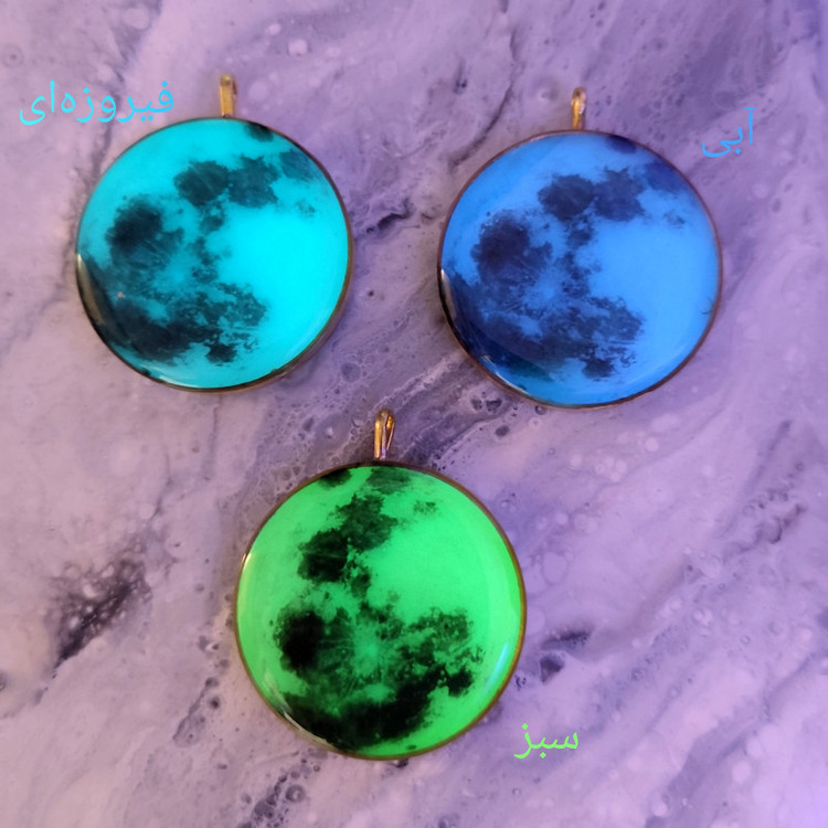 گردنبند رزینی طره ماه شبتاب،جنس فریم تنوع ابی،سبز و فیروزه ای برنجی هست و به رنگ طلایی همراه با زنجیر دیپلمات طلایی ۶۰ سانتی متر ارایه میشود.تنوع نقره ای رنگ فریم نقره ای میباشد و جنس آن استیل است و شبتاب آن به رنگ فیروزه ای میباشد. سایز تمام فریم ها ۴سانتی متر میباشد. این محصول شبتاب با نوری که در خود ذخیره میکند در هنگام شب و در محیط های تاریک نور زیبایی از خود ساطع میکند. هر چقدر محصول در معرض نور مستقیم خورشید یا فلش گوشی قرار بگیرد در محیط های تاریک درخشندگی بیشتری خواهد داشت.