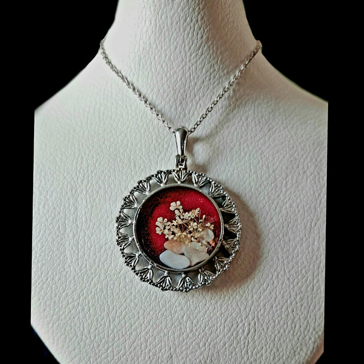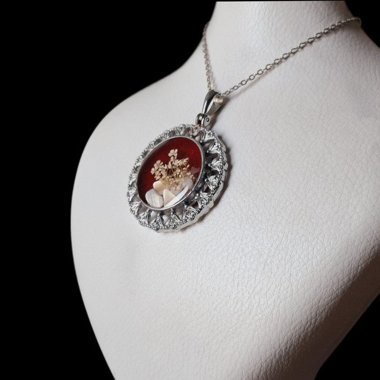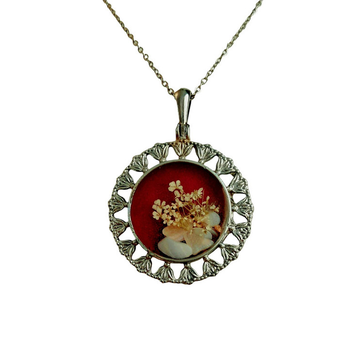 گردنبند زیبای شوکران، ساخته شده از گل خشک طبیعی، سنگ صدف، قاب ریخته گری و تماماً دستساز می باشد. برق زیبای این کار در نور، این کالا را بسیار چشم نواز نموده است. همچنین میتواند بهترین هدیه برای عزیزان شما باشد.