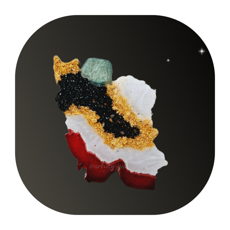 پلاک ایران زیبا و بی نظیر از رزین ، رنگ خمیری، ورق طلا و شن ساحل نقره ای جزیره زیبای هرمز ساخته شده است.