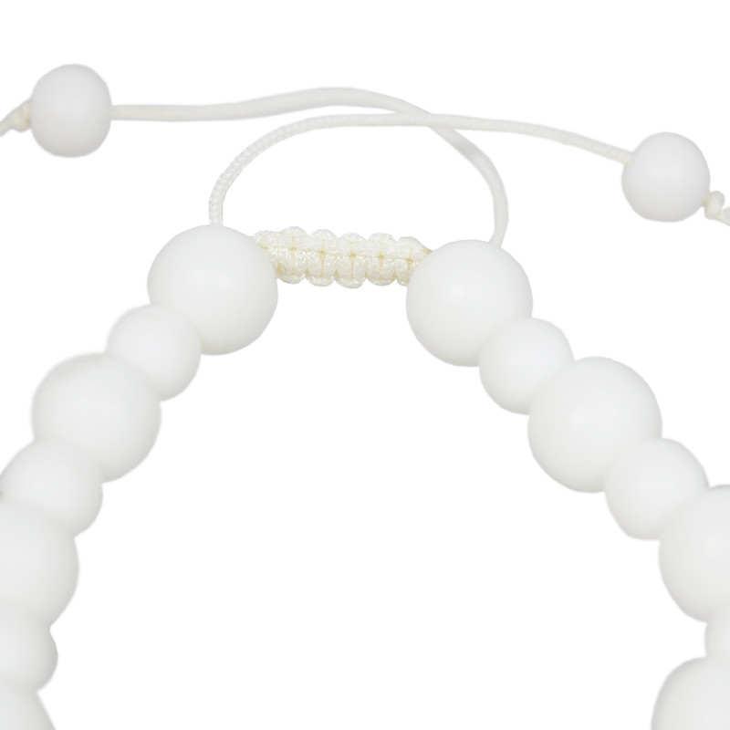 دستبند دستساز که از اونیکس ساخته شده است. وزن تقریبی این دستبند، حدود 12 گرم است. این دستبند، زیبا از اونیکس مصنوعی و نخ درست شده است. این دستبند، 23 قطعه اونیکس ساخته شده است. رنگ این دستبند، سفید است. سنگ این دستبند، حدودا در ابعاد 8 در 8 میلیمتر و 6.5 در 5.5 میلیمتر است. ابعاد این دستبند با گره کشویی، حداکثر 24 سانتی متر و حداقل 16 سانتی متر می باشد.